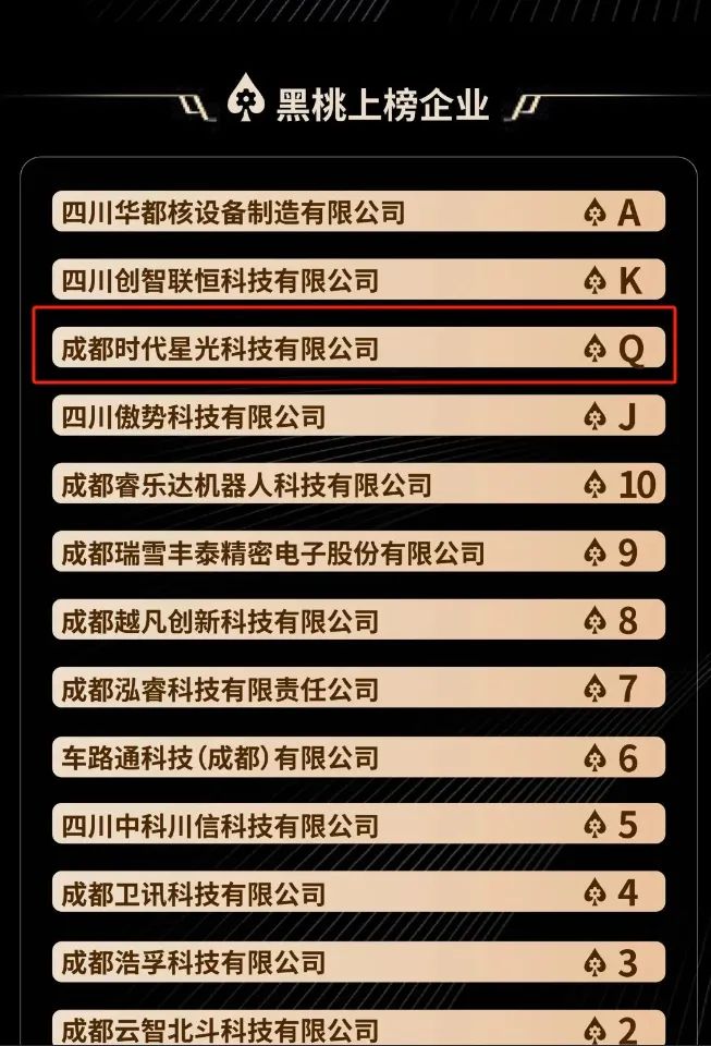 在这场盛大的庆典上,“2023成都硬科技扑克牌”企业排行榜正式揭晓。这一排行榜由20多个省市行业协会联合评选产生,依据创新力、业绩表现和生态贡献三大维度,综合10个评估指标,以及公众投票结果,旨在发掘最具有实力的硬科技企业和企业家。成都时代星光科技有限公司,以其在车载智能无人机与人工智能领域的卓越技术,荣获“2023年度成都硬科技扑克牌——黑桃Q”荣誉。