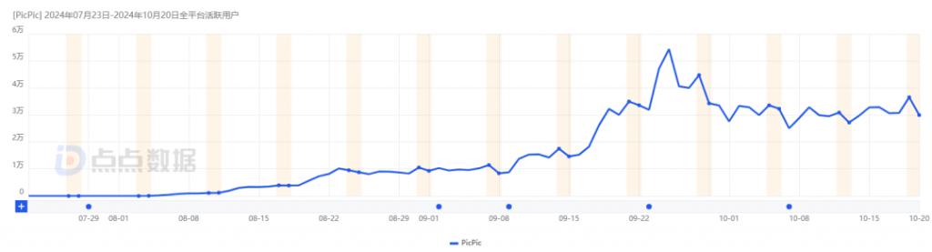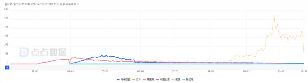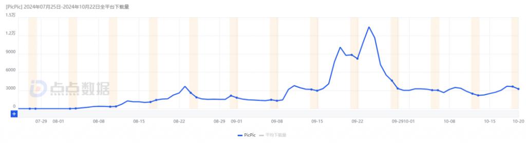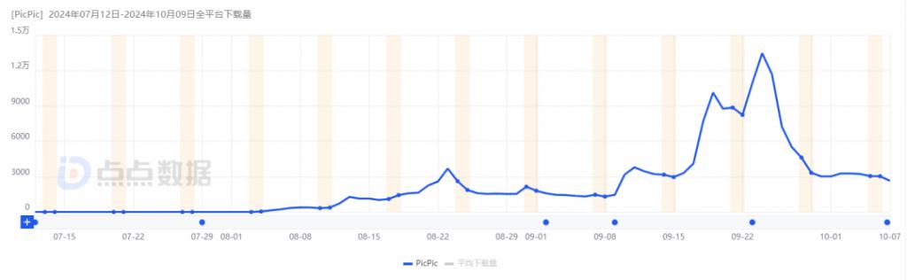 说回本次在日本的增长。PicPic 的起量从 8 月初开始,下载量峰值则出现在了 9 月中下旬,单日下载量最高达到了 1.3W。8 月初至今,PicPic 下载量合计达 24 万左右。