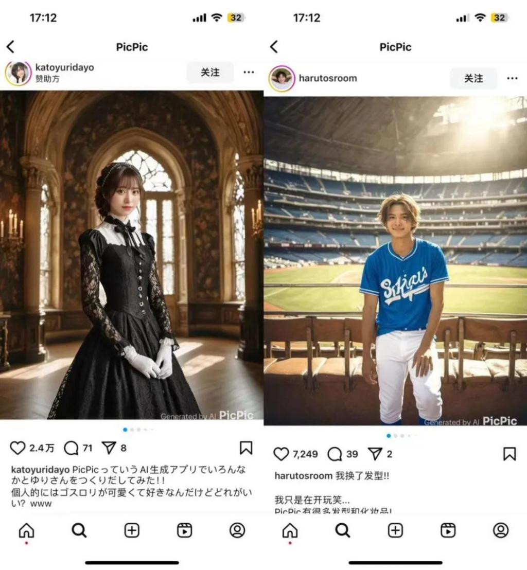 而从社媒上有关 PicPic 或带有 "#picpic"Tag 的帖文来看,大多是一些颜值博主发布自己用 PicPic 制作的照片,然后在文案中推荐 PicPic 的模式,在发布图片时也会着重地露出 "Generated by AI PicPic" 的水印。从点赞和评论的情况来看,多条内容点赞可以达到 2-5 万,也能有几十甚至上百条评论,点赞量能够上千的帖文也很多,而下载量的峰值也在这一时期出现。