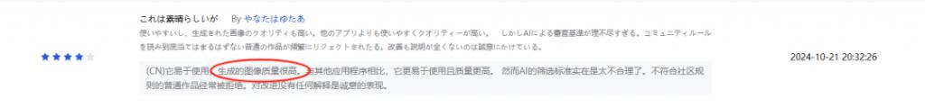 生图质量方面,笔者在测试之后个人认为是较好的。PicPic 对于面部的处理整体来说比较自然,虽然偶尔有面部失真或者手部变形的现象出现,但大多无伤大雅,抽卡成功率较高,此外,对于衣服的刻画算是 PicPic 的亮点,从笔者生成的照片来看,西装的纹理和褶皱确实呈现得比较好。从用户评论中,也同样能印证这一点,经过笔者统计,在近 90 天日本市场的 30 条用户评论中,有 9 条明确地写出了 " 质量高 "" 图片精美 " 等关键词,占比达 1/3。