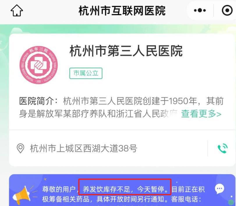 由于年轻人太热情,杭州市三院紧急公众号首页挂出通知," 养发饮库存不足,今天暂停 "。