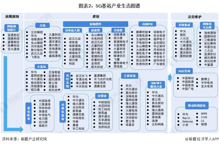 我国 5G 技术发展迅速,目前在 5G 基站产业链各环节聚集了一定规模的参与者,前期规划阶段代表企业如富春股份、宜通世纪等 ; 建设阶段企业数量众多,代表性企业有华为、中兴通讯等,在设备、基站等多环节布局,运营维护阶段代表性企业包括移动、联通、电信等 5G 运营商,华为、紫光股份等系统集成商、三维通信、国脉科技等网络优化运维服务商。各领域相关企业具体如下: