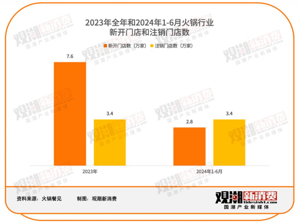 火锅始终是餐饮业里内卷的重灾区。根据火锅餐见数据,2023 年火锅行业新开门店 7.6 万家,退局者 3.4 万家;2024 年 1-6 月份火锅行业新注册门店数是 2.8 万家,而注销门店数是 3.4 万家,退出者远远多于新进者。