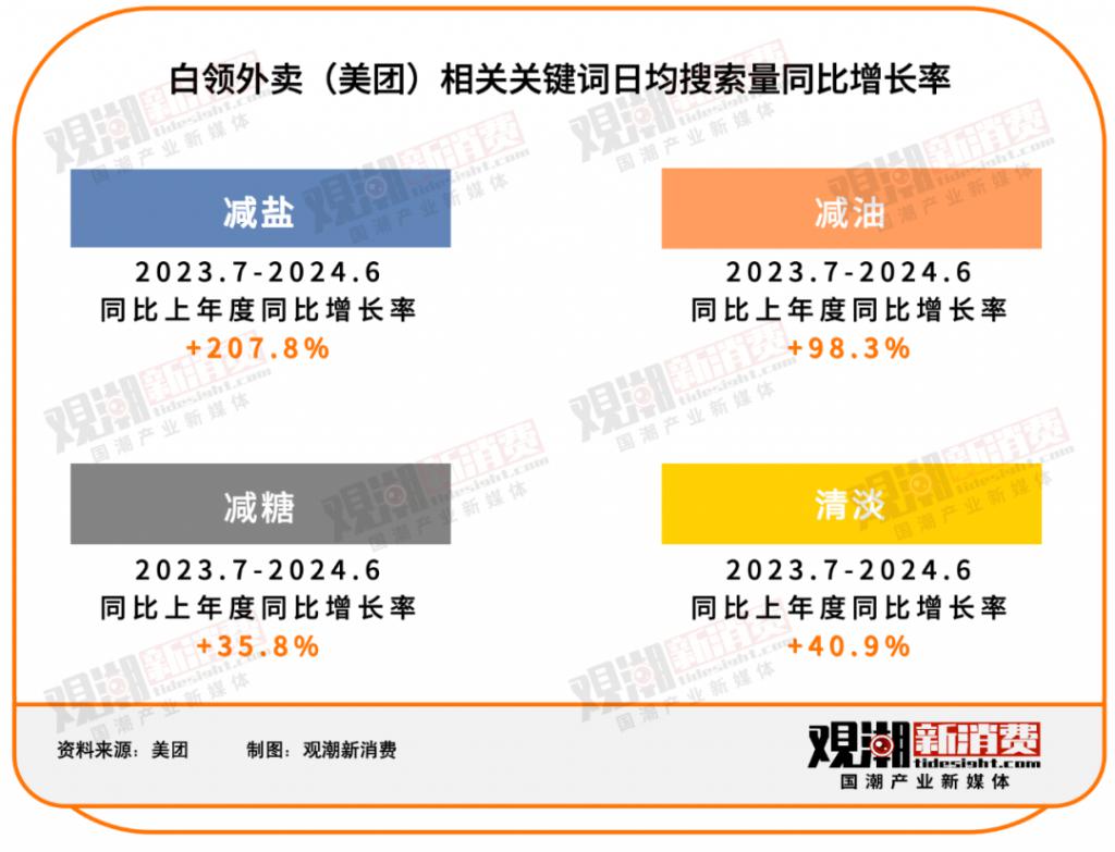 除此之外,美团该份报告还显示," 减盐 "、" 减油 "、" 减糖 "、" 清淡 " 成为日搜索量激增的四大关键词,健康无负担成为外卖选择的重要考量维度。