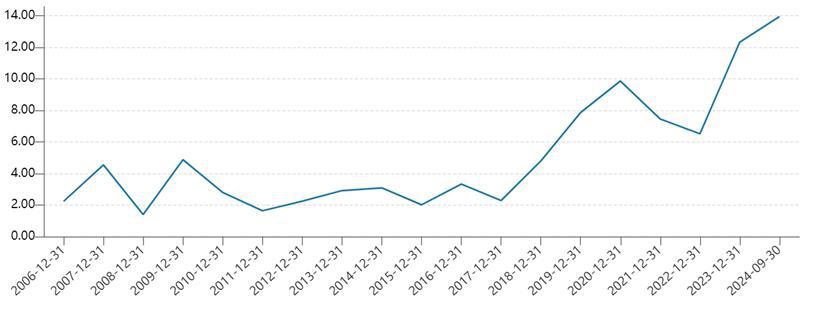 截止 2024Q3,赛轮轮胎净利率为 13.96%,较 2017 年末大幅上升 11.67%。期间,2021-2022 年有所回落,主要是因为原材料中的橡胶价格大幅暴涨,加之海运价格大幅攀升,毛利率显著下滑所致。