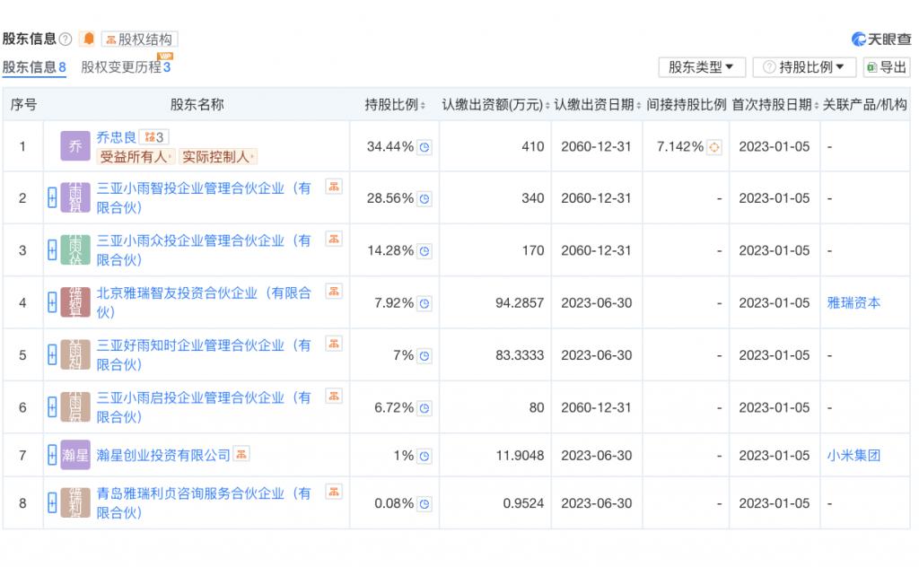 北京小雨智造科技有限公司成立于 2023 年 1 月,由小米集团的核心创始团队创立。其中,创始人乔忠良,系小米初创成员之一,曾担任 MIUI 研发负责人,负责 MIUI9 到 MIUI12 等产品。