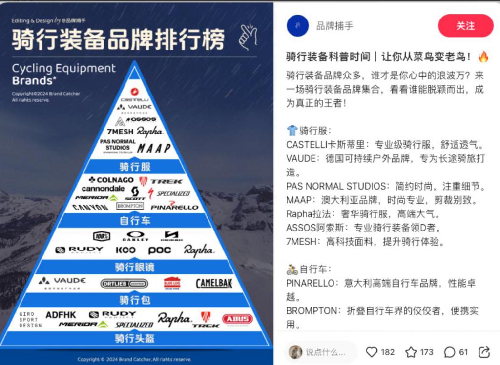 这种现象在 Patagonia、始祖鸟等户外品牌的崛起中已被多次验证。骑行运动也是同理,品牌竞争的核心不再只是产品,而是如何与消费者的价值观形成共鸣。那些能在这场热潮中精准捕捉消费者情感的品牌,才有机会在短暂的风口中,构筑起长期的市场壁垒。