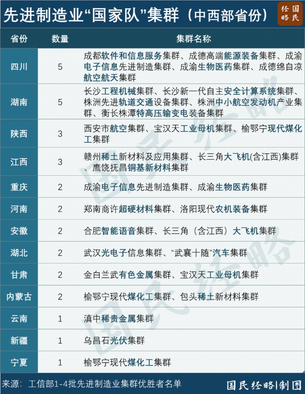 今年 11 月,工信部发布新一批先进制造业集群优胜者名单,四川 2 大集群入围," 国家队 " 集群增至 5 个,与湖南并列中西部地区首位。