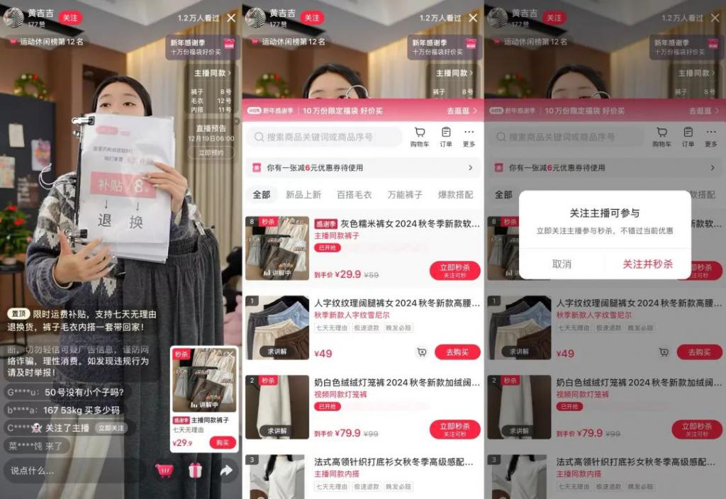 直播期间," 黄吉吉 " 直播间中会经常推出低于页面展示价的 " 秒杀品 ",用户需要关注账号后才有资格购买,直接带动了账号的涨粉速度。