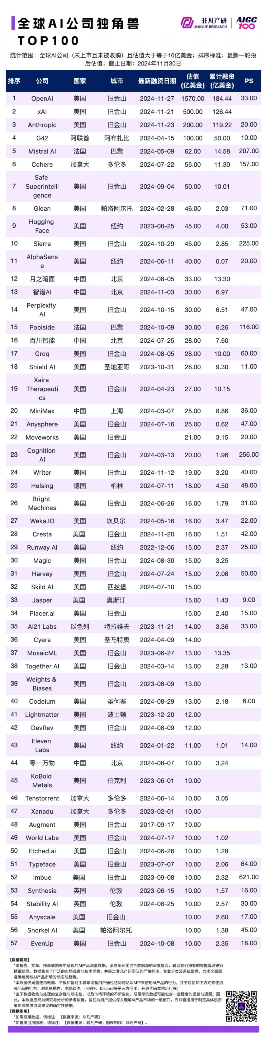 非凡产研根据自身对 AI 产业的独立研究和对全球数千家 AI 公司和近万个 AI 产品的持续追踪,根据当月该 AI 公司的最新一轮投后估值进行排序,整理出全球范围内估值大于等于 10 亿美金的未上市 AI 公司,具体榜单如下: