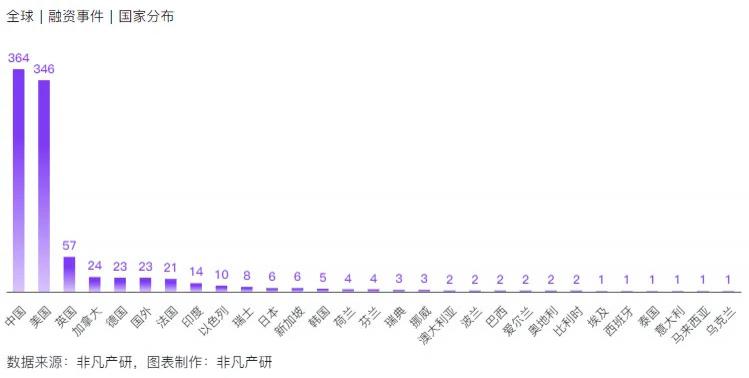 截至在 2024 年 10 月底,美国企业获得了全球最多的融资,以 2532 亿人民币位居榜首;融资次数为 346 次约为中国同赛道融资次数的 95%。赛道内中国企业所获融资总量相当于第三名英国同行的三倍,国内企业累计获融资 364 次,位列投资事件榜首。