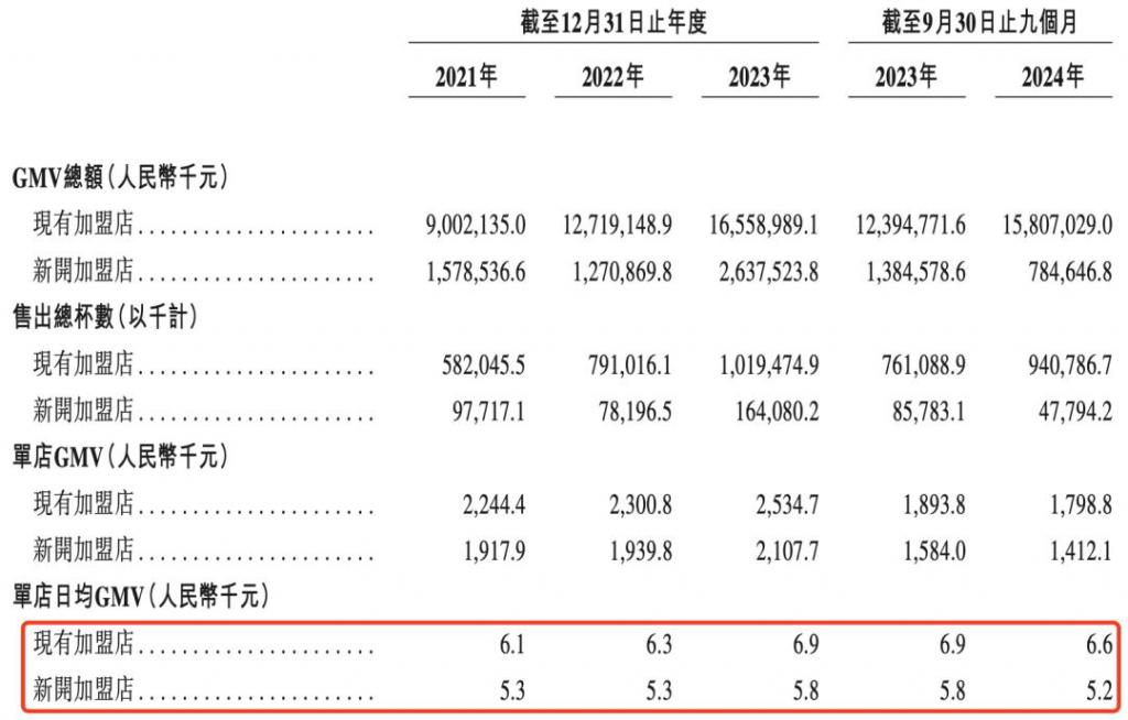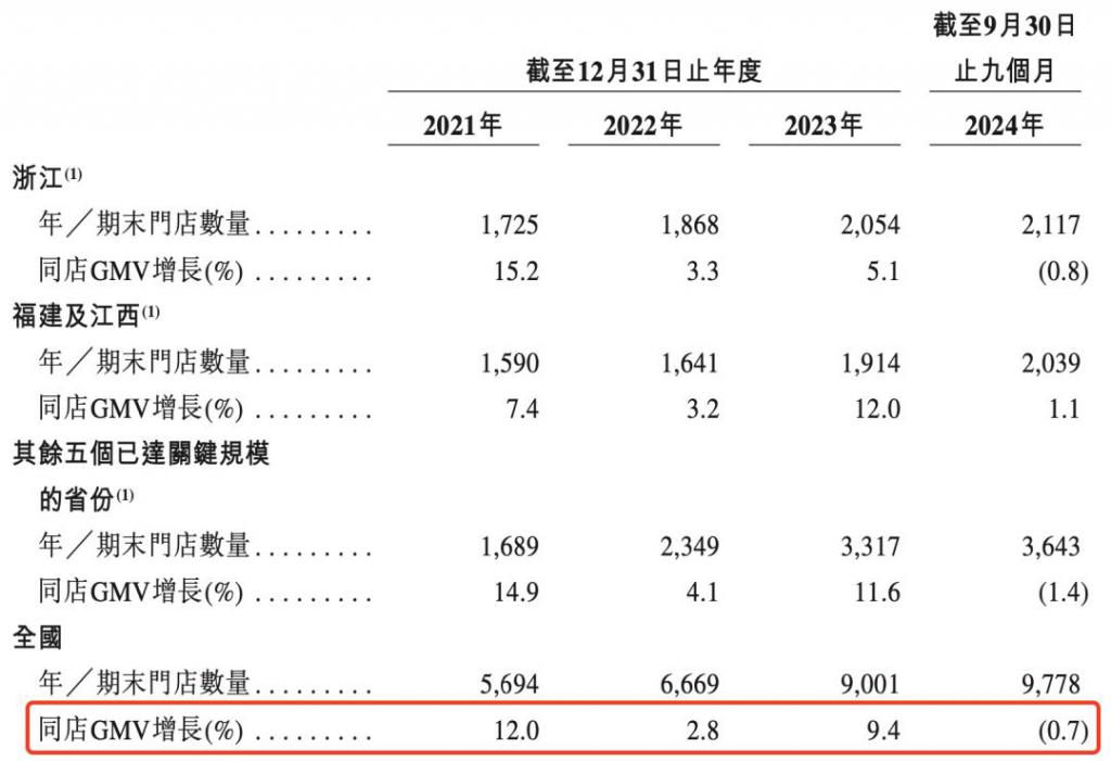 虽然古茗的整体门店规模还在增长,但老店的同店 GMV(已经开业一定时间以上的门店的 GMV)不增反降。除福建及江西两大市场外,今年前三季度,古茗在浙江及其他核心 5 大省份的同店 GMV 出现 0.8% 及 1.4% 的下滑,使得全国同店 GMV 微跌 0.7%,而去年为上涨 9.4%。这也是古茗过去四年首次出现同店 GMV 负增长的情况。