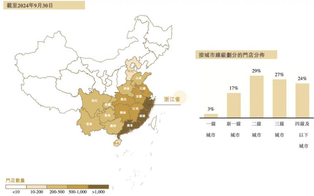 一是 " 下沉 "。根据招股书,截至 2024 年 9 月 30 日,古茗有 80% 的门店位于二线及以下城市,在前五大现制茶饮店品牌中比例最高,根据窄门餐眼数据,超过蜜雪冰城。也因此,很多一二线城市的人都没有听说过古茗。