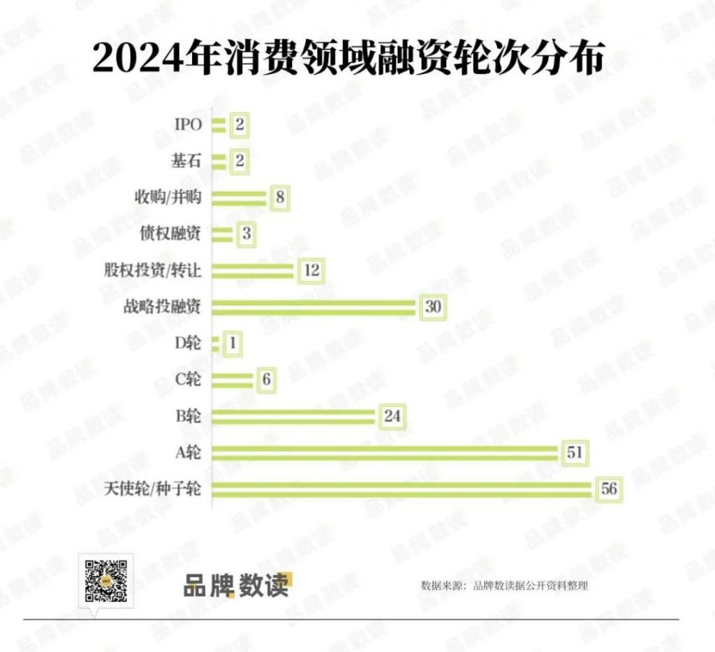 从资本市场来看,消费降级的 2024 年的投融资事件并未出现断崖式下跌,实际情况是与 2023 年整体相仿。据品牌数读不完全统计,2024 年消费领域共有 195 起投融资,与 2023 年的 201 起融资数量相比,仅相差 6 起。