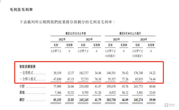 而智能按摩服务又主要分为直营模式和合伙人模式,尽管合伙人模式的收入远低于直营模式,但其毛利率却显著高于直营模式,具体情况如下: