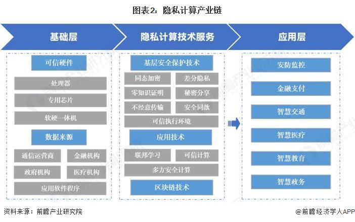 从产业链的角度来看,隐私计算行业的上游主要为加密芯片、专业处理器等可信硬件及隐私数据来源方 ; 中游则是隐私计算技术及服务提供,包括同态加密、差分隐私等基层安全保护技术,联邦学习、可信计算、多方安全计算等应用技术,以及区块链技术。隐私计算的下游为应用层,涵盖企业、政府、金融、教育、安防等多领域。