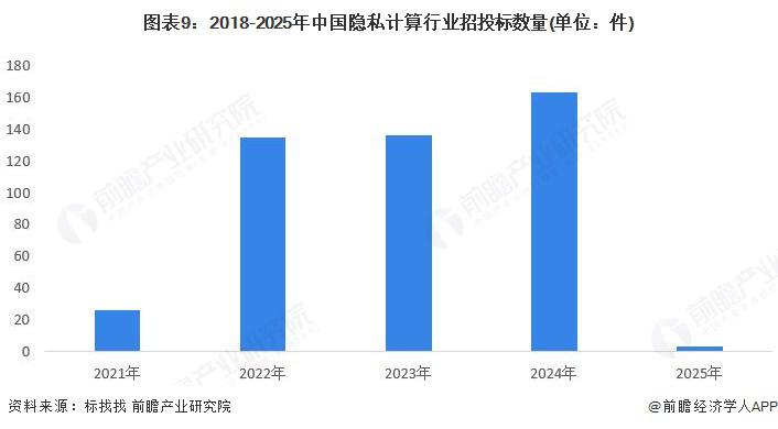 2021-2024 年,中国隐私计算行业招投标数量整体迅速增长,市场活跃度高,2024 年中国隐私计算行业招投标数量同比增长 20%;2025 年截至 1 月 23 日,隐私计算行业招投标数量 3 件。
