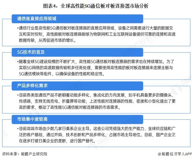 全球高性能 5G 通信板对板连接器市场正在快速发展。随着电子设备功能变得越来越丰富,设备内部的结构更加紧密,零部件也朝着高精密度发展。产品制造商对高效互连解决方案的需求日益增加。板对板连接器具有多功能性和紧凑的设计,可以有效地满足这一需求。高性能 5G 通信板对板连接器可实现物联网组件之间的无缝通信和数据传输,满足了当下小型化、高速数据传输、信号完整性和可靠互连的需求。当前,全球高性能 5G 通信板对板连接器市场主要呈现以下特征。