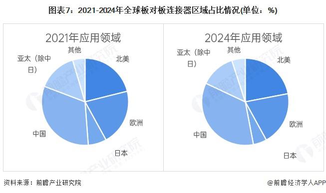 高性能 5G 通信板对板连接器对当地的通信基础设施建设有较高的要求。目前北美、欧洲等地区的高性能通信传输基础设施建设相对完善,根据 Bishop&Associates 数据显示,中国是板对板连接器最大的市场,占比 32%,北美地区占比 21.1%,欧洲占比 20.9%,日本占比 6.8%。初步测算,2024 年中国比重提升至 35%,是全球最主要的消费市场。