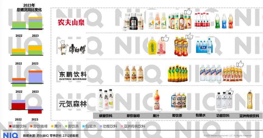 与此同时,元气森林、东鹏特饮、农夫山泉、大窑等国产饮品在细分赛道里占据一席之地。