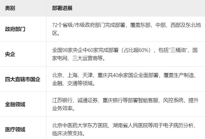 这些事实迅速在发生。2025 年年初以来,全国已有超过 200 家企业完成本地化部署,覆盖政府机构、央企、国企、金融机构、医疗机构及科技企业等多个领域。