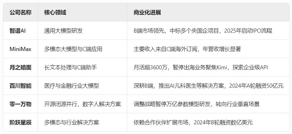 竞争者中,此前提到的 " 大模型六小龙 ",主要指的是 " 成长期新势力 "(不包含巨头)。而走到今天,这些新势力里,部分企业已经转型走细分路线,比如零一万物退出综合大模型竞争,而百川智能则转向垂直大模型。