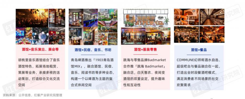 为满足市场多样化需求,近年来部分酒企与酒馆品牌积极探索并创新 " 酒馆 +" 的多业态混合经营模式,通过灵活融合餐厅、音乐演出、书店 / 图书馆、展会、零售等多种业态,构建出扩展性较强的复合型消费体验空间,提供 " 一站式 " 服务,与用户实现多时段交互,提升坪效及用户体验。