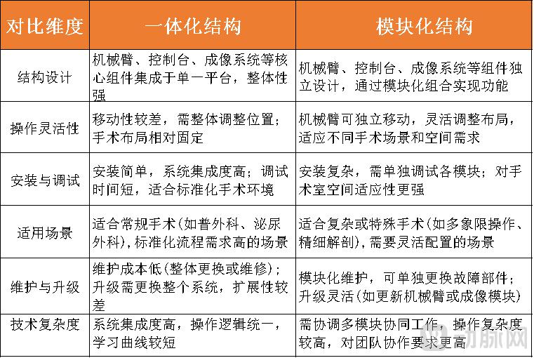 二者对比,分体式设计最显著的优势在于,其模块化台车可根据术式灵活摆位,更好适配不同手术以及手术室环境;一体两面地,其局限性在于,台车排布和装机效率相对较低,且由于各模块需要协同工作,对兼容性和稳定性要求高,调试和维护工作更为复杂;一体化设计系统集成度高,各部件协同工作更流畅,性能和稳定性经过充分验证;局限性则在于功能和配置相对固定,难以根据手术不同需求和医院条件灵活调整。
