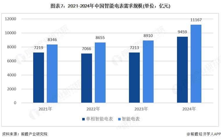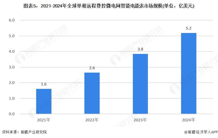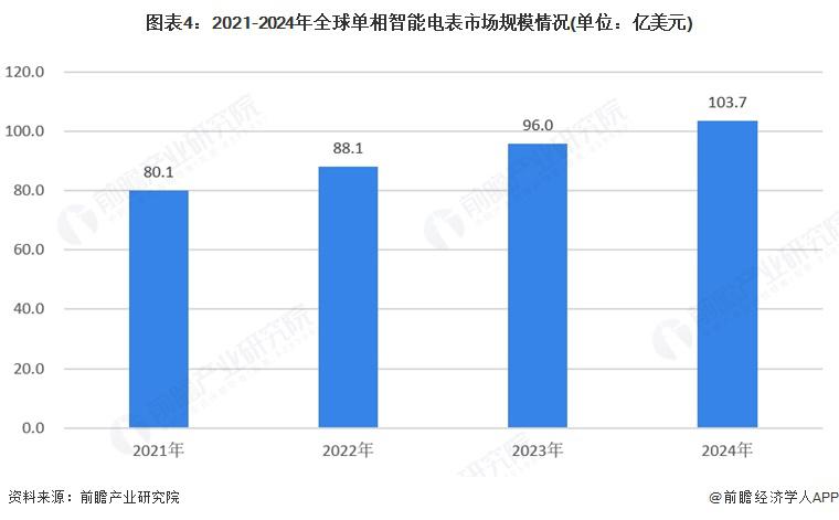 居民用电、工业用电和商业用电是全球智能电网配电的三大场景,从国家电网招投标数据来看,单相智能电能表产品在智能电网用电中处于主导位置,单相智能电能表市场规模预计占整体智能电表市场的 85%。2023 年、2024 年全球单相智能电表市场规模分别为 96.0 亿美元、103.7 亿美元。