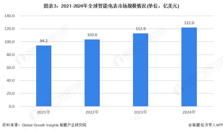 在全球经济持续增长的推动下,全球能源需求持续攀升,同时环保要求对碳排放限制的加强,促使风能、太阳能等清洁能源的快速发展。此外,能源互联网、物联网技术的快速发展,为全球能源格局带来了新的变革,智能电网在全球范围内快速普及。智能电网需要高级的计量基础设施,以确保有效的能源分配和网络监控。智能电网作为智能电网的关键终端设备,在电力数据采集、电力监测、电网通信、电力系统管理、分布式能源接入管理、电网故障诊断等环节发挥着重要作用,随着全球智能电网行业的发展,全球智能电表产品需求持续扩大。根据 Global Growth Insights 数据,全球智能电表市场规模从 2023 年的 112.9 亿美元增长到 2024 年的 122 亿美元,同比增长 8.1%。