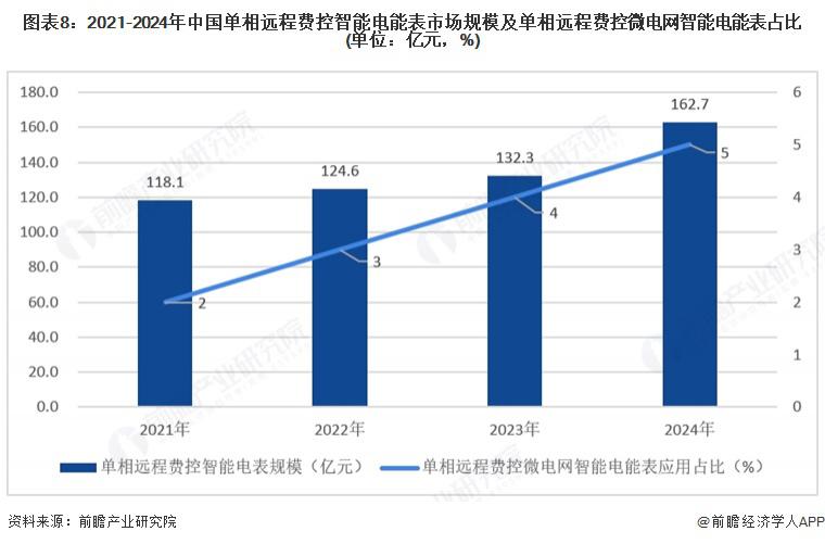 随着中国新型能源建设的不断推进,智能微电网建设的普及对单相远程费控智能电能表的智能控制、保护和管理提出了更高的要求。根据前瞻数据,单相远程费控微电网智能电能表等高端智能电表占单相智能电表应用比重由 2021 年的 2% 上升至 2024 年的 5%。