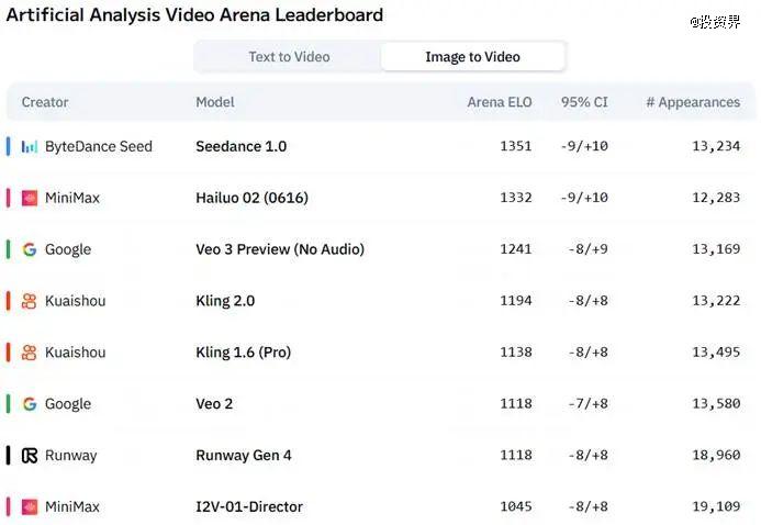 令人惊讶的是,在 AA 视频竞技场视频竞技排行榜中, Hailuo 02 已在 "Image to Video" 栏目中高居第 2 位。