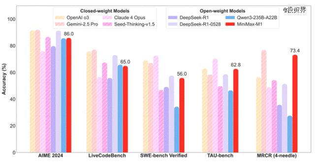 于是,MiniMax-M1 模型应运而生。作为本次 " 发布周 " 的第一个重头戏,MiniMax-M1 留给外界深刻印象。技术报告显示,M1 模型支持目前业内最高的 100 万上下文的输入,跟闭源模型里面的 Google Gemini 2.5 Pro 一样,是 DeepSeek R1 的 8 倍,以及业内最长的 8 万 Token 的推理输出。