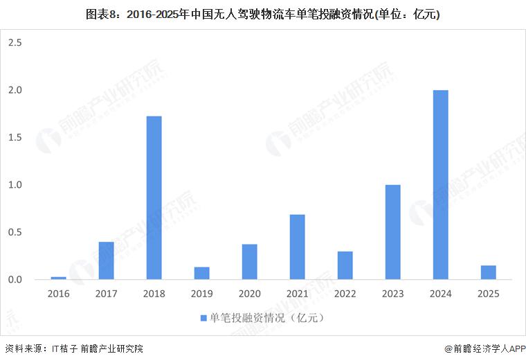 目前, 2016-2025 年我国无人驾驶物流车行业投融资事件数量较少且投融资金额较低,2018 年投融资事件数量和金额均为最多,分别为 4 件和 6.9 亿元。从单笔投融资金额情况来看,2018 年、2023 年以及 2024 年均超过 1 亿元,分别为 1.7 亿元、1 亿元和 2 亿元。其余年份单笔投融资金额均较低,大部分年份未超过 0.5 亿元。