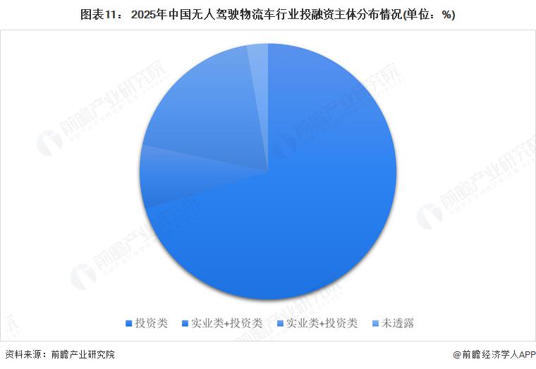 根据对无人驾驶物流车行业投资主体的总结,目前我国无人驾驶物流车行业的投资主体主要以投资类为主,代表性投资主体有中金资本、普华资本、兴湘资本、睿住资本等等 ; 实业类的投资主体有美团、顺丰控股和长城汽车等。