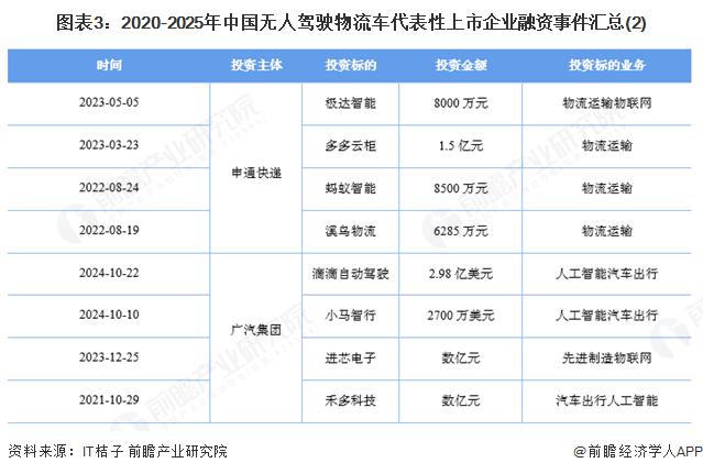 从 2020-2025 年中国无人驾驶物流车代表性上市企业融资事件汇总可知,京东物流、顺丰控股、美团、申通快递和广汽集团作为无人驾驶物流车行业的代表性上市公司,其投资重点涉及人工智能、物流运输、物联网等业务领域,该些上市公司均致力于通过人工智能业务加快物流运输车实现自动化、无人化的进程。