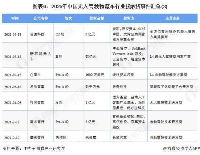 2021 年 -2025 年我国无人驾驶物流车行业的主要投融资事件主要集中在白犀牛、新石器无人车、惠尔智能和毫末智行等 L4 自动驾驶解决方案商、L4 级无人驾驶商用车厂商和 L4 级自动驾驶技术开发商,涉及无人驾驶物流车的技术研发、生产制造以及解决方案等企业。