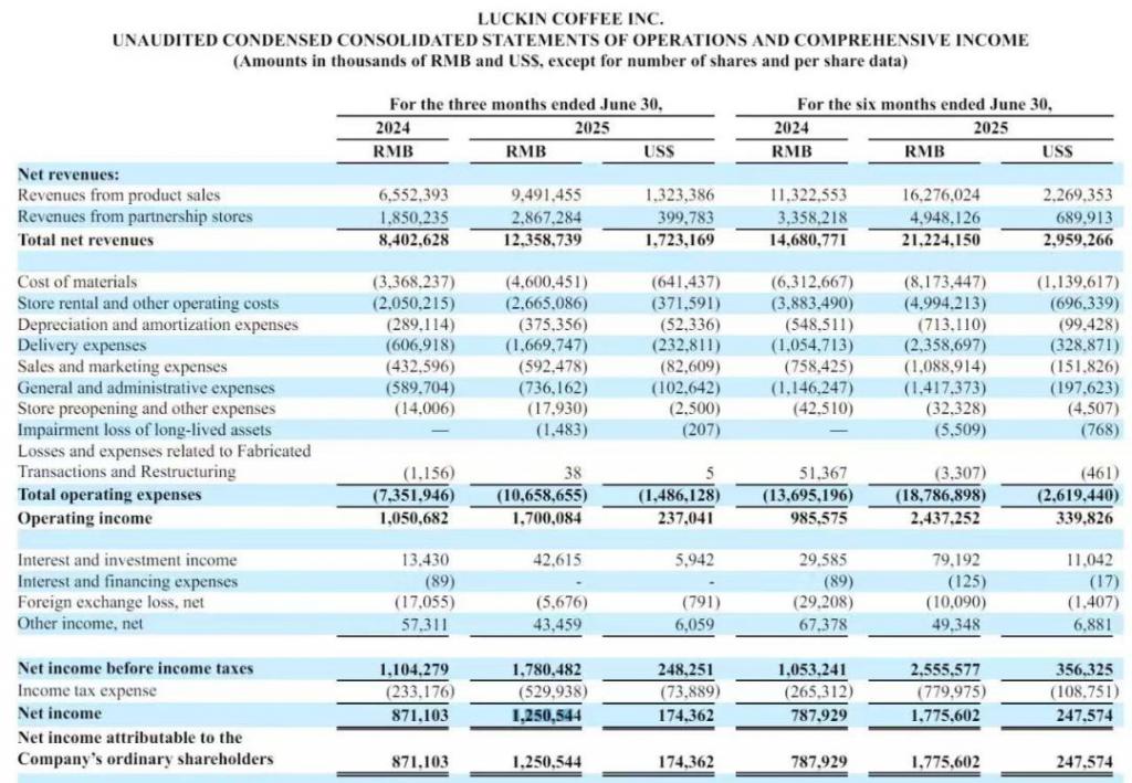 瑞幸咖啡 2025 年第二季配送费用为 16.697 亿元(约 2.328 亿美元),较 2024 年同期的 6.069 亿元增长 175.1%。