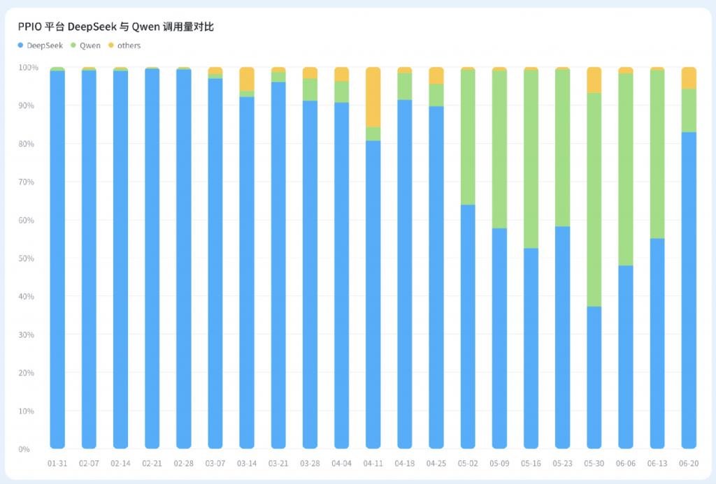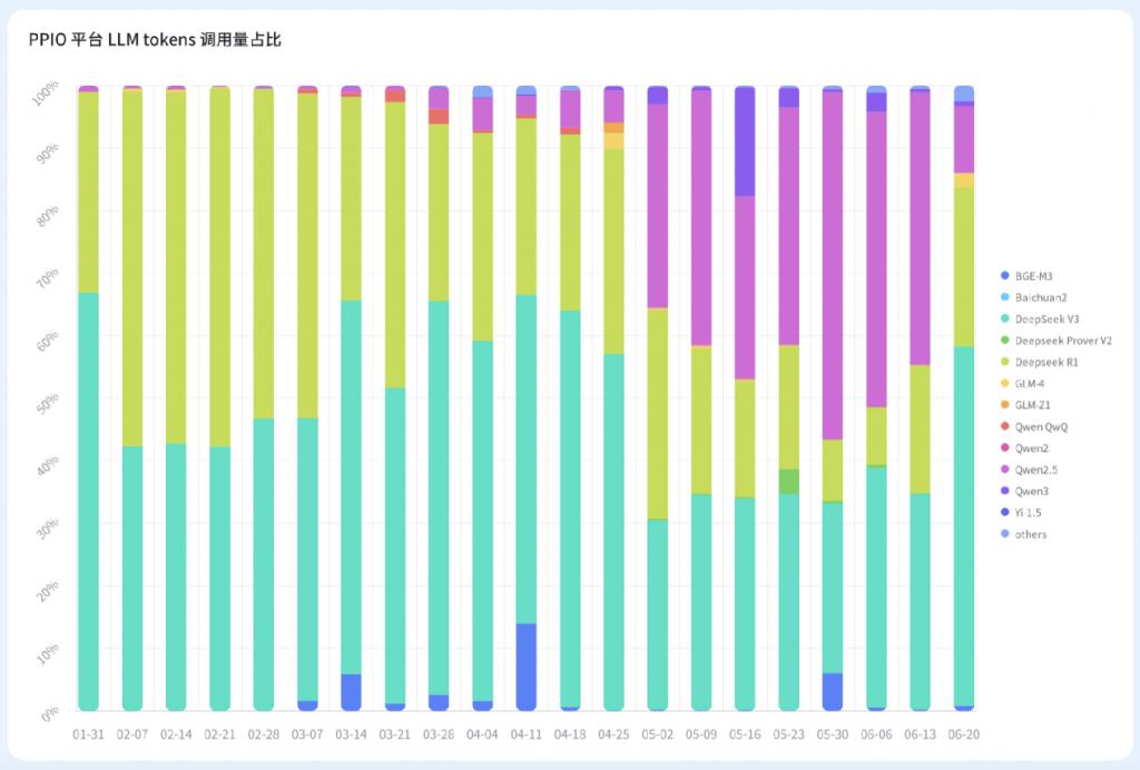 Qwen 就是其中的一个代表。PPIO 目前上线了 Qwen 的三个系列—— Qwen2、Qwen2.5 和 Qwen3,前两者是 2024 年发布的模型,Qwen3 在今年 4 月 29 日首发上线 PPIO 。从 2025 年第二季度开始,PPIO 平台的 Qwen 模型的使用量开始高速增长,到 5 月下旬时调用量占比超过一半,最高时达 56%,与 DeepSeek 一同称为最受欢迎的两大开源模型。