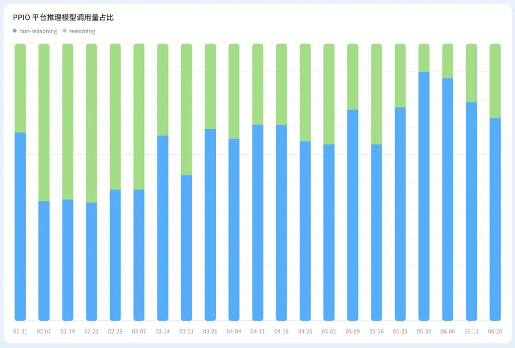 2025 年 2 月份,推理模型受到广大 AI 开发者的青睐,其全平台的使用量占比保持在 50% 以上。但从 3 月份开始,非推理模型的使用量反超推理模型,并一直延续至今。