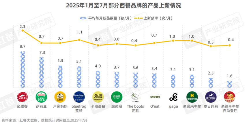 近年来,餐饮市场的竞争日趋白热化,为了在市场中站稳脚跟,众多品牌纷纷加快了产品创新步伐,西餐品牌亦是如此。据红餐产业研究院不完全统计,2025 年 1 月至 7 月,必胜客累计推出了 60 余款新品,平均每月新品数量达到 8.7 款;萨莉亚、卢家妈妈、bluefrog 蓝蛙、卡朋西餐等品牌的月均新品数量也均超过了 5 款。